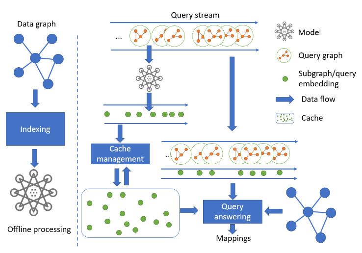 第二篇文章发表在 vldb‘20。以下是它的算法框架,它的主要思路是:处理查询流时,将处理完的查询进行缓存,并通过 MPNN 为该查询图生成 embedding,作为索引。由于查询图之间的相似性与它们的embedding之间的相似性相关,算法在处理新的查询时,会通过它的embedding找到和它相似的k个缓存查询(通过 KNN),然后再在它们中找到最相似的缓存查询来加速新查询。