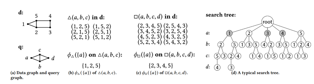 第三篇工作发表在 vldb'23。这篇工作设计了一种高效的过滤器,用于在子图匹配搜索过程中进行剪枝。并且这种过滤器可以利用过去查询的匹配结果构建,来剪枝未来查询的搜索空间。下面是一个过滤器的例子:d是数据图,q是查询图,(b) 和 (c) 是两个过滤器,(b) 表示在数据图中有哪些节点会出现在一个三角形子图中。而 (c) 表示在数据图中有哪些节点会出现在一个四边形子图中。当处理查询 q 时,节点 a 既出现一个三角形中,又出现在一个四边形中,所以可以用 (b) 和 (c) 两个过滤器进行过滤。只有 2 和 5 满足这样的条件。