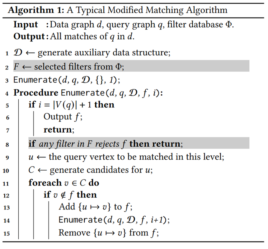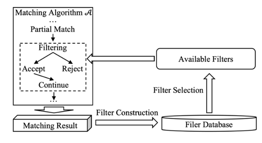 当 是 的子图的时候,可以使用 来进行剪枝。下图是在一个常规的子图匹配搜索算法中加入过滤器剪枝的方法:预处理阶段会进行过滤器的筛选,为每层选取最有效的过滤器。在搜索过程中,当当前的部分匹配被过滤器拒绝时,直接返回。