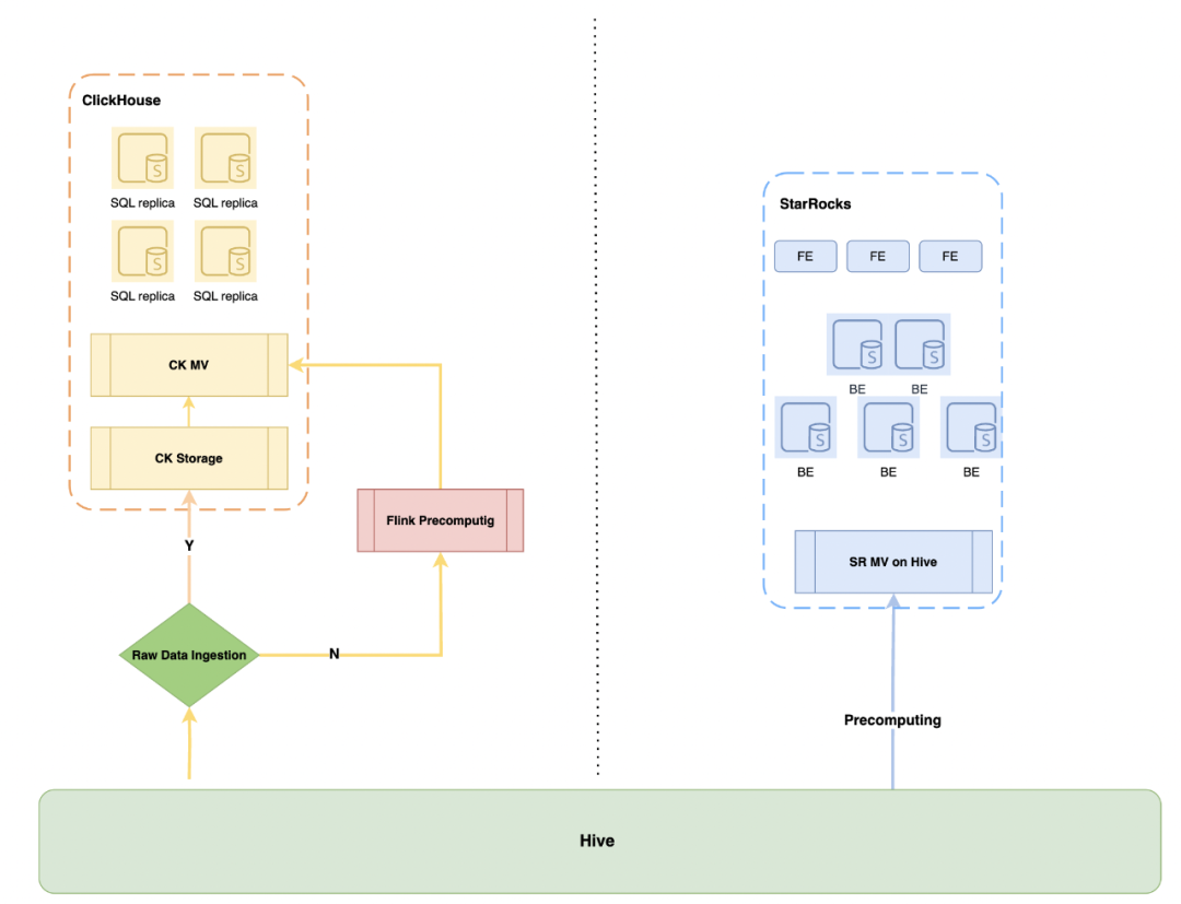 其他引擎如 ClickHouse 也可以利用物化视图来预计算查询数据。然而ClickHouse 对数据湖的支持有限,并且在社区路线图中没有开发计划。这意味着使用 ClickHouse 实现类似 OLAP 的功能需要手动开发 API,或者将 Hive 数据传输到 ClickHouse 并使用 ClickHouse 的 MV 进行预计算。或者,可以使用 Flink 实现实时预计算逻辑,然后将结果写入 ClickHouse。不论选择哪种方法,都需要大量的人力支持,并且还会增加 ETL 管道组件的成本