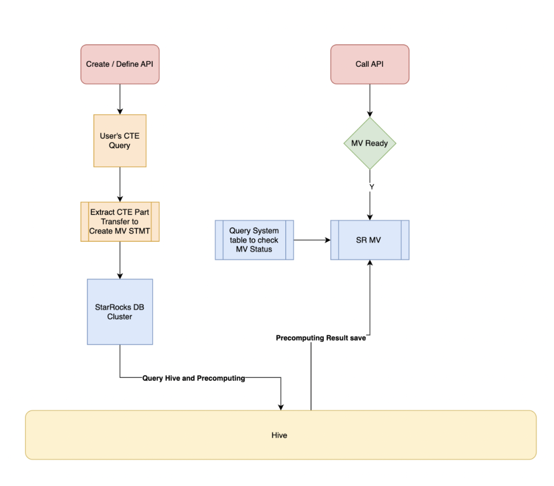c. 使用 StarRocks 在 Hive 上的 MV,用户无需维护从 Hive 到 OLAP 引擎的实时或近实时写入管道。这不仅节省了用户在人工资源开发成本上的支出,也减少了实时管道所需的组件成本。此外,这种方法对用户的使用没有任何影响;他们无需做任何工作就能从 API 查询性能的提升中受益。这种方法也大大提升了用户业务推广的效率。