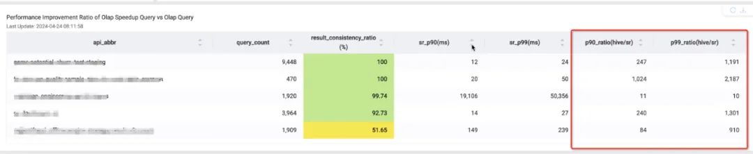 在上图中,第二列,query_count,表示在所选时间窗口(24小时)内调用当前API的次数。第三列,result_consistency_ratio,指示了 StarRocks 加速结果与直接使用 Presto 查询 Hive 结果之间的比较。(第五个 API 的低准确性是因为其存储表每小时更新一次,而标记设置为每日更新。StarRocks 材料化视图的刷新取决于标记配置。)第四和第五列分别显示了在使用 StarRocks 材料化视图加速后的查询延迟 p99 和 p90。最后两列代表了使用 StarRocks 材料化视图相对于直接在 Hive上使用 Presto 进行查询的性能改进,分别针对 p90 和 p99 的查询