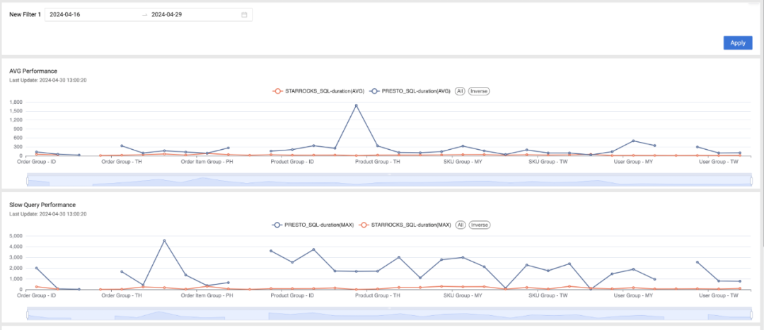 Data Go 已经实施了使用 StarRocks 代替 Presto 进行表连接查询的策略。在多个国家的多个数据模型上进行了使用 StarRocks 和 Presto 的查询性能对比测试。