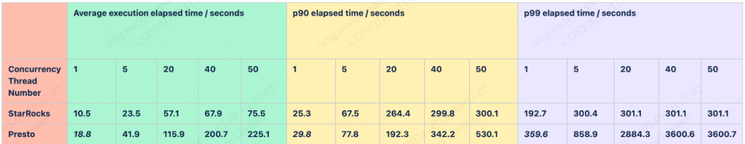 测试方法:分别使用1、5、20、40和50个线程并发压力测试 StarRocks 和 Presto。