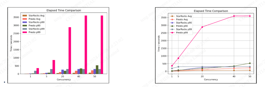 StarRocks 在给定时间段内执行速度更快,而 Presto 较慢且倾向于排队,导致大部分 API 调用的延迟时间花费在排队上。