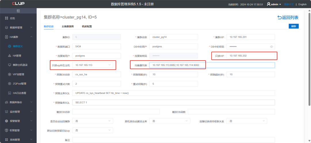 HA集群->集群定义->编辑,进入集群信息编辑界面,在此界面中配置集群的只读VIP、只读VIP所在主机、均衡器列表这三项配置: