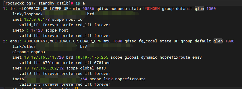 [pg14@clup ~]$ psql -h 10.197.165.202 -p 5435 -U postgres -d postgresPassword for user postgres:psql (14.13)Type "help" for help.postgres=# select inet_server_addr();inet_server_addr------------------10.197.165.113(1 row)
