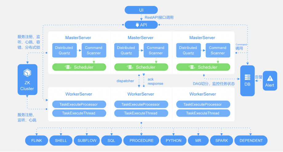 下图是 Dolphinscheduler 的架构图,最上面的 UI 是用户可以感受到的界面, Open API