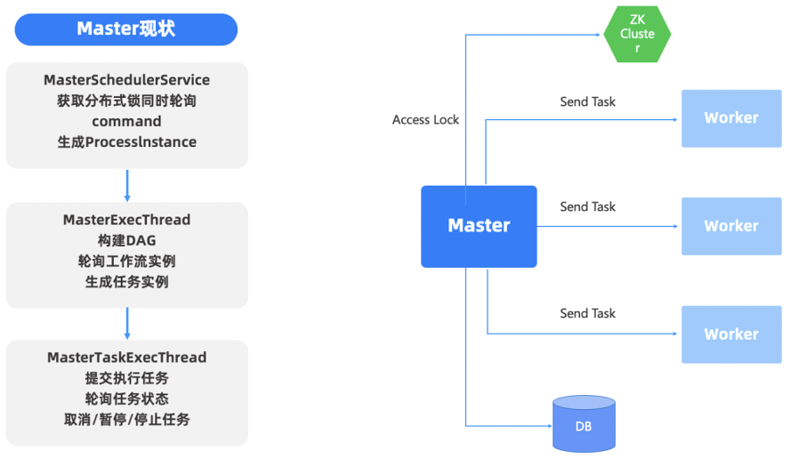 在最初的架构设计中,MasterSever 和 WorkerSever 完全隔离,WorkerSever 拿到任务之后,把任务更新到数据库里面,导致 WorkerSever 对于数据库造成的压力非常大。