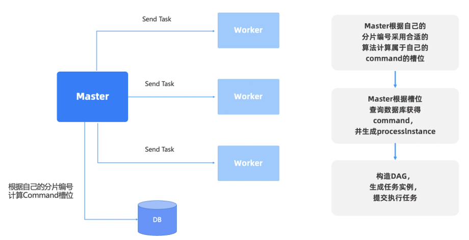 先去做分片,注册 MasterSever 会生成一个分片编号,Command 是执行的工作流,在去分布式锁的时候进行了这样的一个设计,根据槽位查询数据库,然后会生产工作流的实例,交给 Worker 执行,根据分片的槽位去计算。