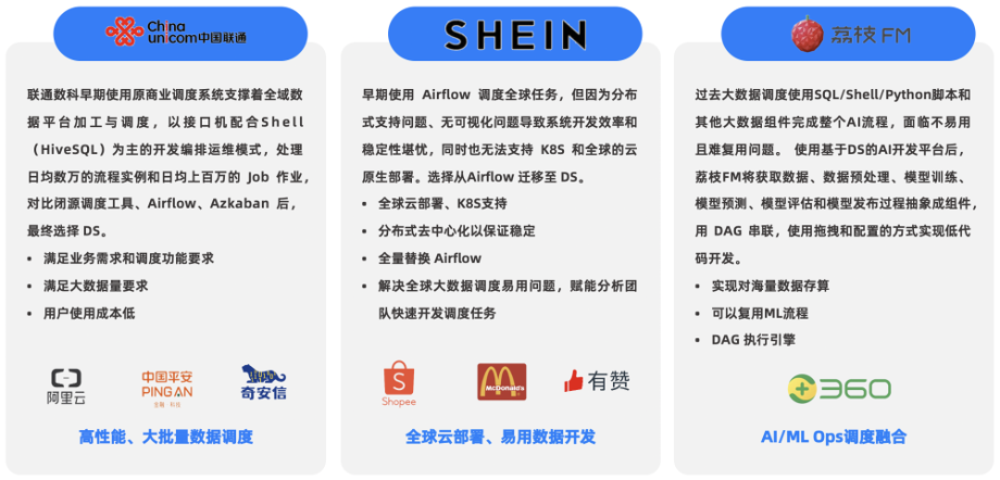 Dolphinscheduler 在海内外拥有丰富的用户基础,如中国联通、Shein、荔枝 PM、360 等,希望Dolphinscheduler 调度系统能为更多的用户带来便利。