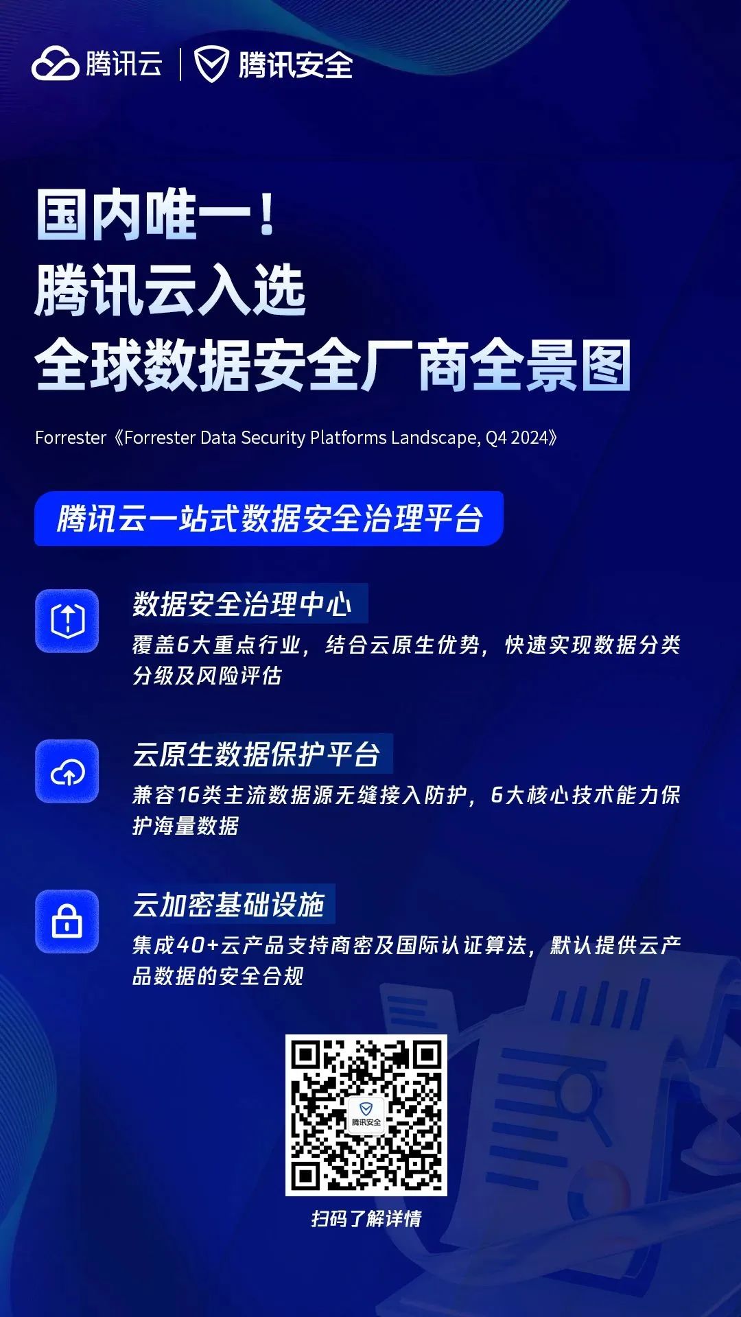 近日,国际权威咨询机构Forrester发布了《Forrester Data Security Platforms Landscape, Q4 2024》报告(以下简称“报告”),报告概述了35家DSP供应商在规模、产品类型、地理位置和用例差异等方面的不同之处,腾讯云凭借在数据安全领域的技术探索与能力沉淀,成为唯一一家入选该报告的中国区厂商。作为腾讯云数据安全解决方案的重要组成部分,大数据开发与治理平台WeData为企业提供一站式数据安全,具备开箱即用、高性能、细粒度管控、免改造接入等特点。