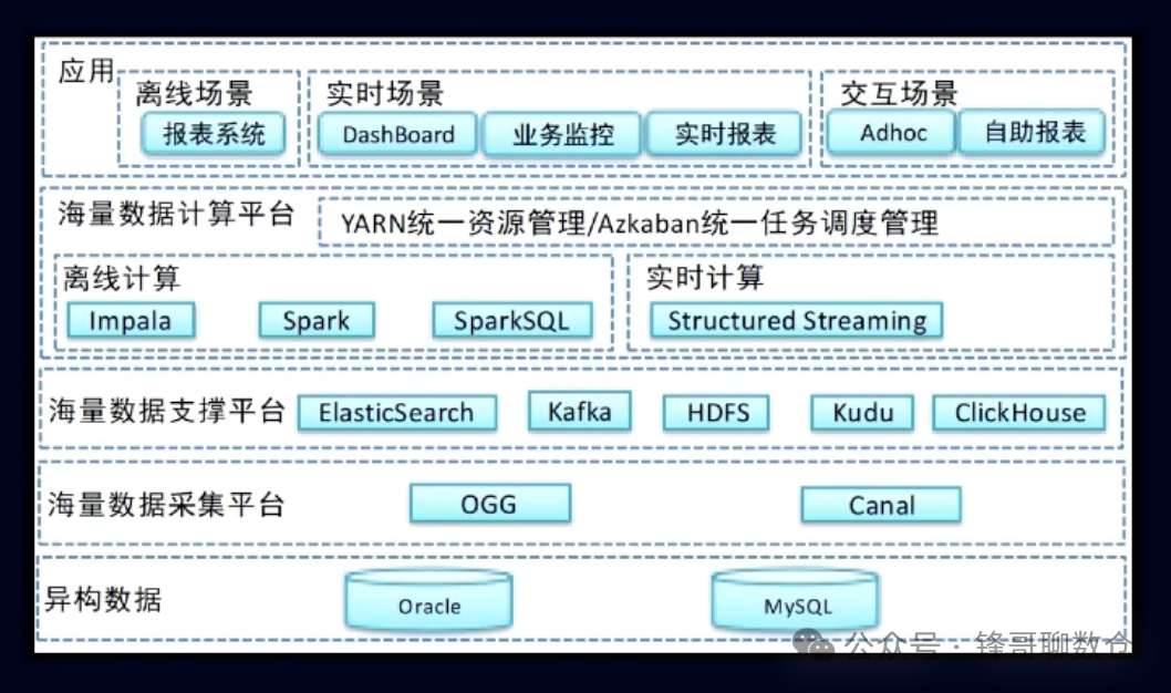 自下而上是数据的整个流动过程,从数据采集开始,到多种不同的存储体系,再向上形成了“离线计算”和“实时计算”的两种计算模式,最上层是数据的消费部分,且带有交互分析的场景。