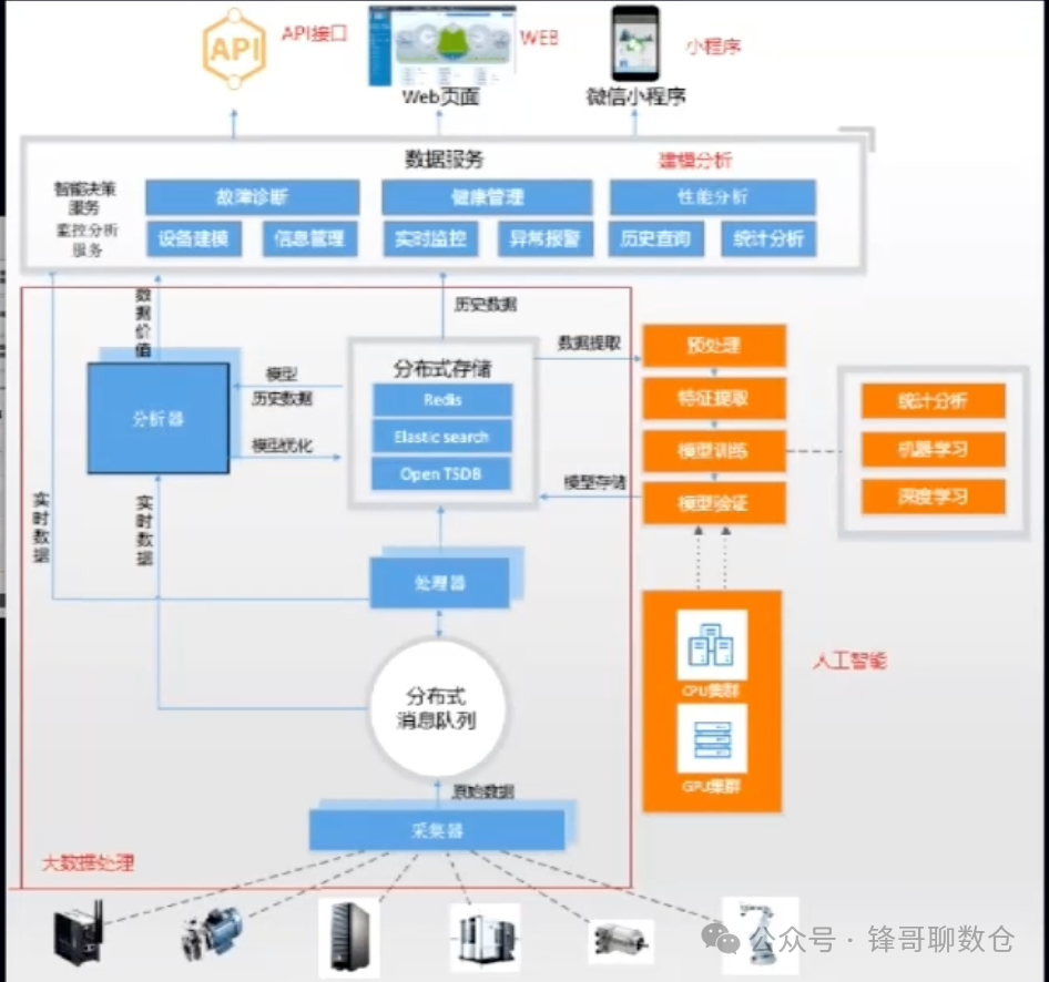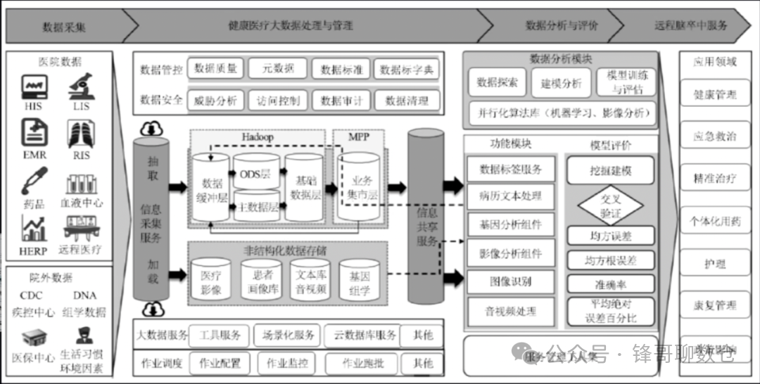 与前面例子的差异点在于,医疗系统中会存有大量图像与视频数据,因此整个架构的底部会有一层面向非结构化数据存储的存储体系,以及右侧还有面向医疗领域机器学习的智能图片识别能力,这便是在前一个例子数据分析系统的基础上迭代了一些 AI 的能力。