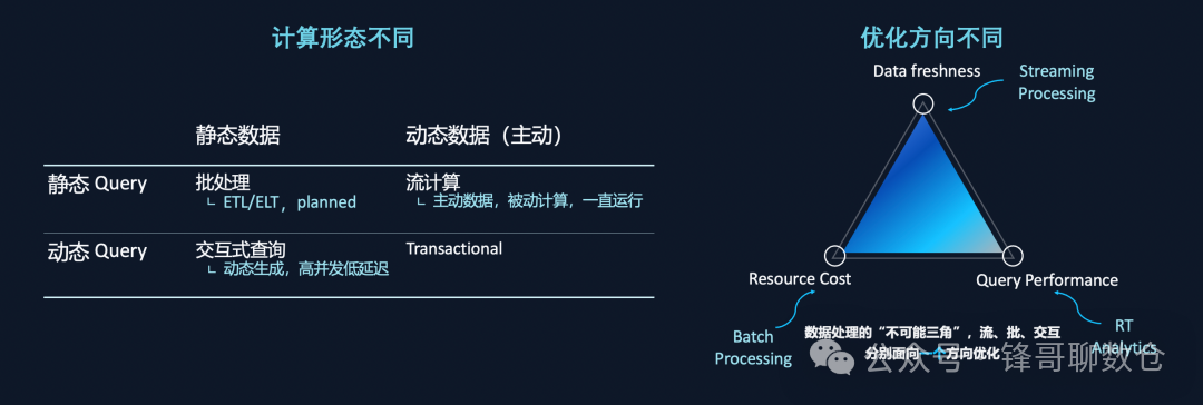 上图三角为数据平台不可能三角,即一个平台不可能同时实现数据新鲜度、低成本和高性能三个目标。如流计算优化的是数据的新鲜度,引擎等数据,为了使得下一条数据进来时计算的足够快,引擎是一直拉起的状态,Reserve 了大量资源。实时数仓系统是面向性能的,也需要等待数据,需要一个非常快的数据。批处理计算面向的是 Throughput ,即 Latency 延迟,能够提供很高的 Throughput,带来很低的 Cost。不同的优化方向使得三个引擎也不同。