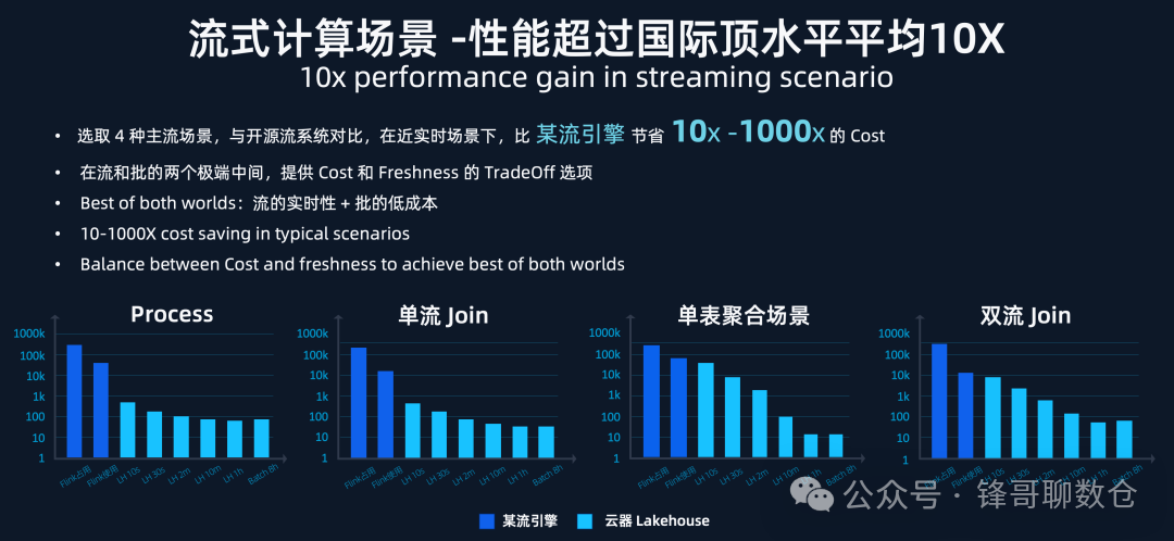 上述测试表明,云器Lakehouse在流处理场景上,比常规流式引擎有10x-1000x的资源消耗节省。并且,基于增量计算在“流”和“批”两个极端场景中间,让数据新鲜度和处理成本可以被精益平衡;让用户既可以获得“流”的实时性,又可以得到“批”的低成本。
