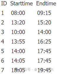 create table meeting as(select 1 id,'08:00' starttime,'09:15' endtimeunion allselect 2,'13:20','15:20'union allselect 3,'10:00','14:00'union allselect 4,'13:55','16:25'union allselect 5,'14:00','17:45'union allselect 6,'14:05','17:45'union allselect 7,'18:05','19:45')