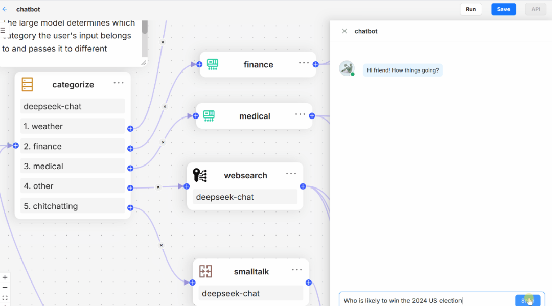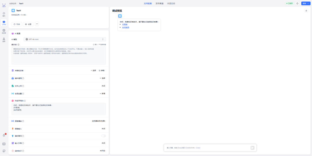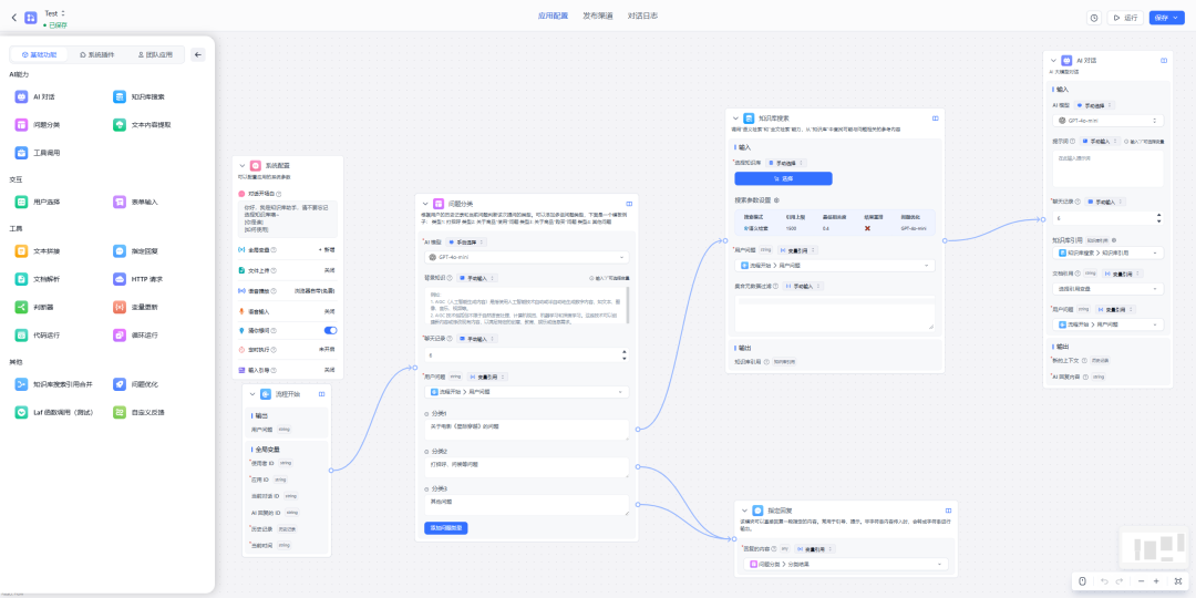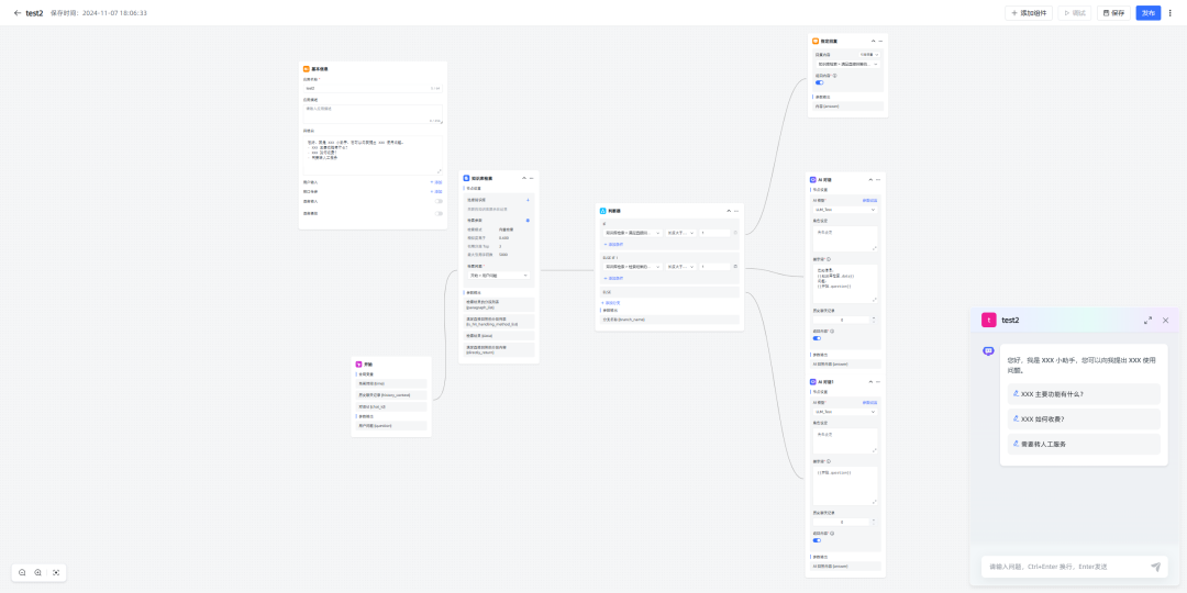 工作流构建:在可视化画布上设计和测试高效的AI工作流程,集成了丰富的功能。