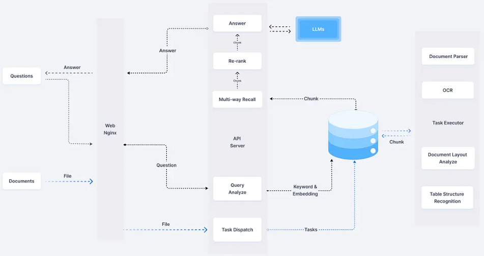 模板驱动的文本处理: 提供智能且可控的文本切片技术。 多种文本模板可供选择,以增强文本处理的灵活性和可解释性。 降低幻觉风险: 实现文本处理过程的可视化,并允许手动调整。 确保答案的可靠性,通过提供关键引用快照和支持追溯来源来减少幻觉(hallucination)。 异构数据源兼容性: 支持多种文件类型,包括 word 文档、ppt、excel表格、txt文件、图片、pdf、影印件、复印件、结构化数据和网页等,以适应不同数据源。 自动化RAG工作流: 提供全面优化的 RAG 工作流,适用于从个人到大型企业的多种生态系统。 支持配置大型语言模型(LLM)和向量模型。 采用多路召回和融合重排序技术。 提供易于使用的API,方便集成到各种企业系统中。
