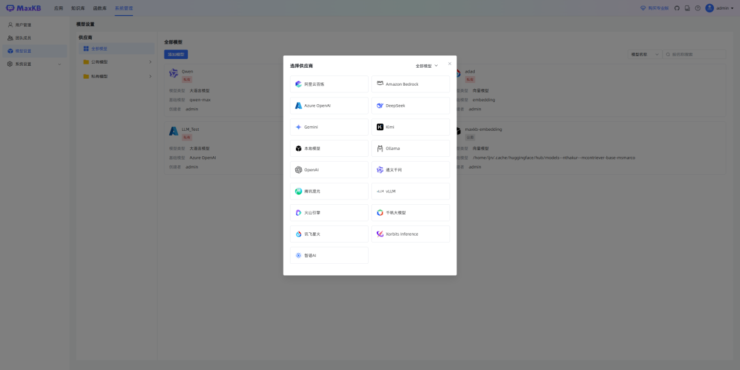 模型兼容性:系统支持连接多种大型语言模型,包括本地私有模型(如Llama 3、Qwen 2等)、国内公共模型(如通义千问、智谱AI、百度千帆、Kimi、DeepSeek等)以及国际公共模型(如OpenAI、Azure OpenAI、Gemini等)。