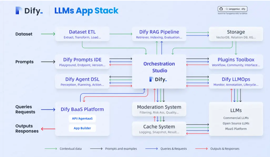 Dify是一个开源的LLM应用开发平台,它结合了后端即服务(Backend as Service)和LLMOps的概念,旨在帮助开发者迅速构建生产级别的生成式AI应用。该平台的独特之处在于,它不仅面向技术人员,还使得非技术背景的用户也能轻松参与到AI应用的设计和数据管理中。