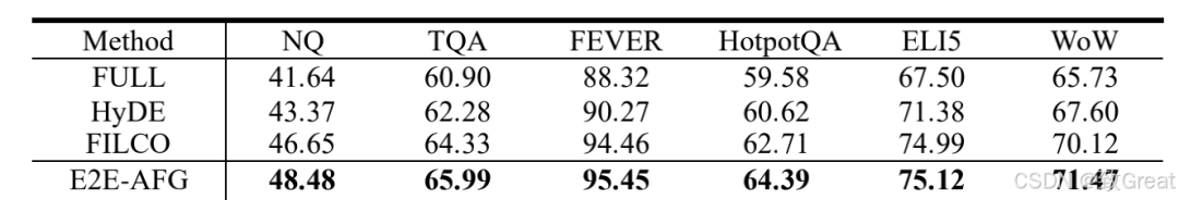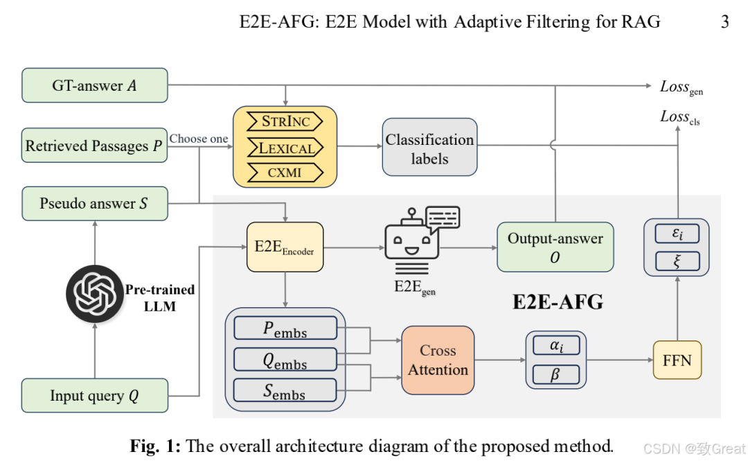 E2E-AFG(End-to-End Model with Adaptive Filtering for Retrieval-Augmented Generation)的端到端模型,通过以下几个关键步骤解决检索增强型生成任务中的问题:1. 集成答案存在判断和文本生成任务E2E-AFG将分类任务(判断上下文中是否包含答案)和生成任务(生成回答)集成到一个统一的端到端框架中。这种设计允许模型同时学习上下文过滤和答案生成。2. 生成伪答案(Pseudo-Answers)为了增加模型生成准确答案的可能性,E2E-AFG首先使用预训练的大型语言模型为输入查询生成一个相关的伪答案。这个伪答案作为额外的参考,帮助模型产生更准确的回答。3. 上下文过滤策略E2E-AFG采用了三种上下文过滤策略来获取银牌分类标签(silver classification labels),用以判断检索到的段落集和生成的伪答案是否包含答案: