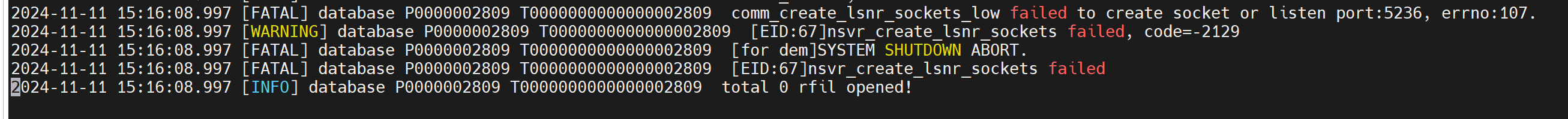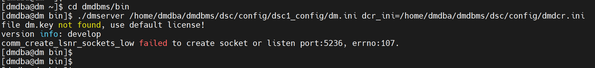 查看dmserverDSC日志文件显示warning报错如下,初步猜测和端口有关,通过查询code=-2129提示说这个代码为无效的端口号,于是检查我自己的dminit.ini,dmdcr.ini和dsc路径下dminit生成的dm.ini文件发现配置均正常,继续排查,进入bin目录,查询原单机dmserver服务是否开启,不查不知道,一查发现两个节点的dmserver均开启的,因为原单机环境的数据库端口和现在DSC集群端口都是5236,所以在单机环境运行的情况下去启动DSC集群服务自然会有端口冲突的问题