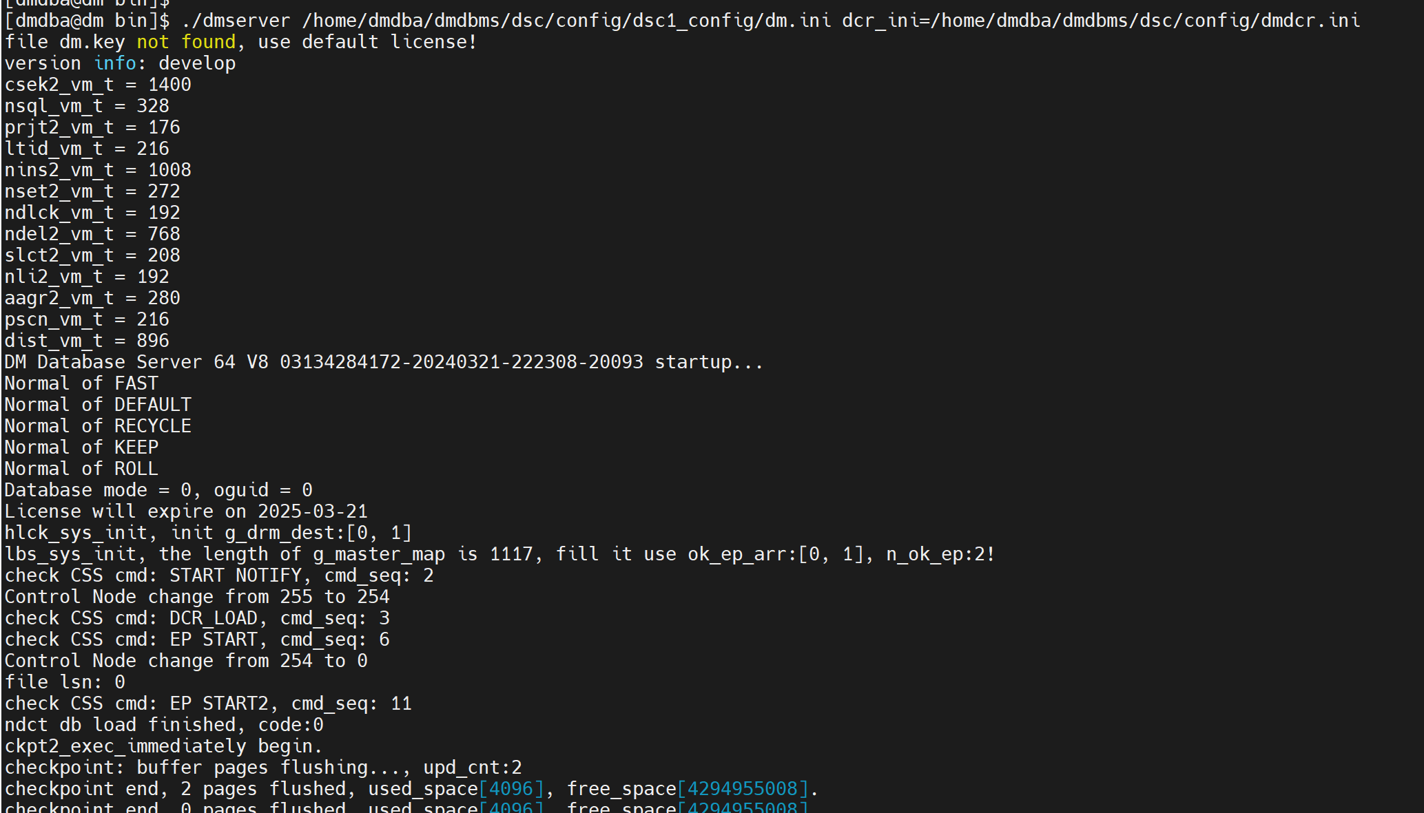 ./dmserver /home/dmdba/dmdbms/dsc/config/dsc1_config/dm.ini dcr_ini=/home/dmdba/dmdbms/dsc/config/dmdcr.ini