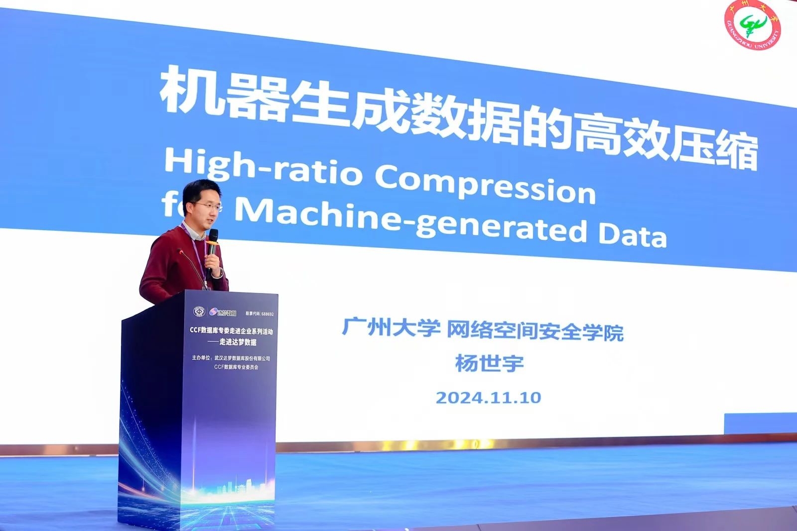 广州大学网络空间安全学院教授杨世宇在现场作《机器生成数据的高效压缩》的报告,提出了针对机器生成数据的高效压缩方法,为降低数据存储成本、提升数据处理效率提供了有力支持。