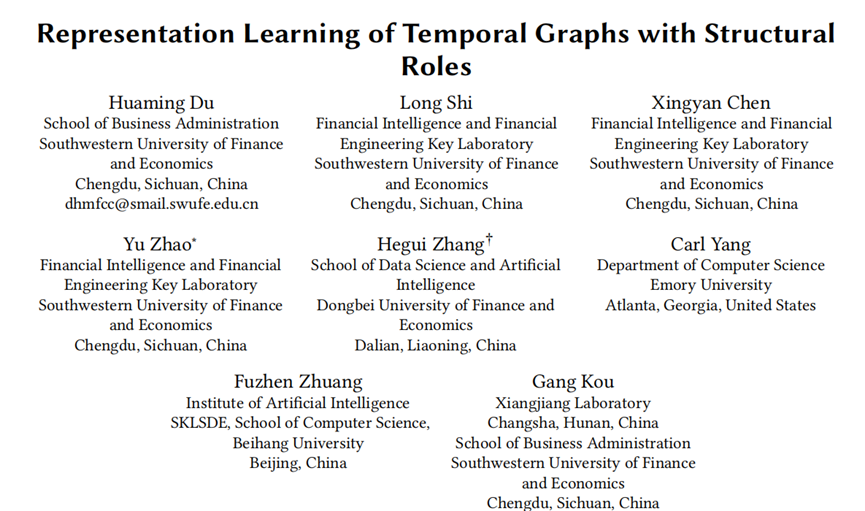 本周推荐的KDD 2024上的论文:Representation Learning of Temporal Graphs with Structural Roles,该文提出了一种基于角色的时间图卷积网络RTGCN,通过结合全局结构角色信息和节点结构角色演变,有效提升了时间图表示学习的性能。作者来自西南财经大学、东北财经大学、埃默里大学、北京航空航天大学和湘江实验室。