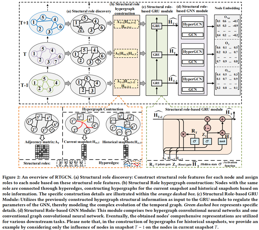 近年来,时间图表示学习引起了广泛关注。大多数现有工作主要侧重于建模时间图的局部结构依赖性。然而,低估许多实际时间图中的固有全局结构角色信息不可避免地导致次优的图表示。为克服这一缺点,作者提出了一种新颖的基于角色的时间图卷积网络(RTGCN),充分利用了时间图中的全局结构角色信息。具体而言,RTGCN可以通过超图卷积神经网络有效地捕获静态全局结构角色。为了捕捉节点结构角色的演变,作者进一步设计了基于结构角色的门控循环单元。最后,作者在目标函数中整合了结构角色的接近性,以保持全局结构相似性,从而进一步提升时间图表示学习。在多个实际数据集上的实验结果表明,RTGCN在各种时间链路预测和节点分类任务中,相较于最新的时间图表示学习方法,始终以显著优势优于后者。具体而言,RTGCN在链路预测中实现了最多5.1%的AUC提升,以及在新链路预测中实现了最多6.2%的F1提升。此外,RTGCN在节点分类中实现了最多4.6%的AUC提升,并在结构角色分类中实现了最多2.7%的AUC提升。