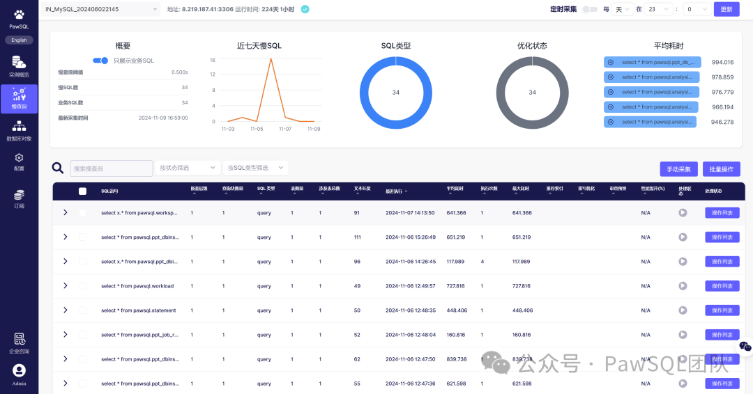 PawSQL平台提供了全面的慢查询管理功能,包括自动采集、分析、优化等多个环节。通过管理台的慢查询趋势图,用户可以直观地了解数据库的性能状况,并进行深入分析。