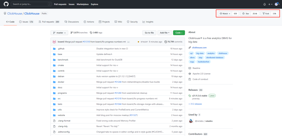 GitHub的ClickHouse已经有2万多颗Star,Fork了将近4千次,