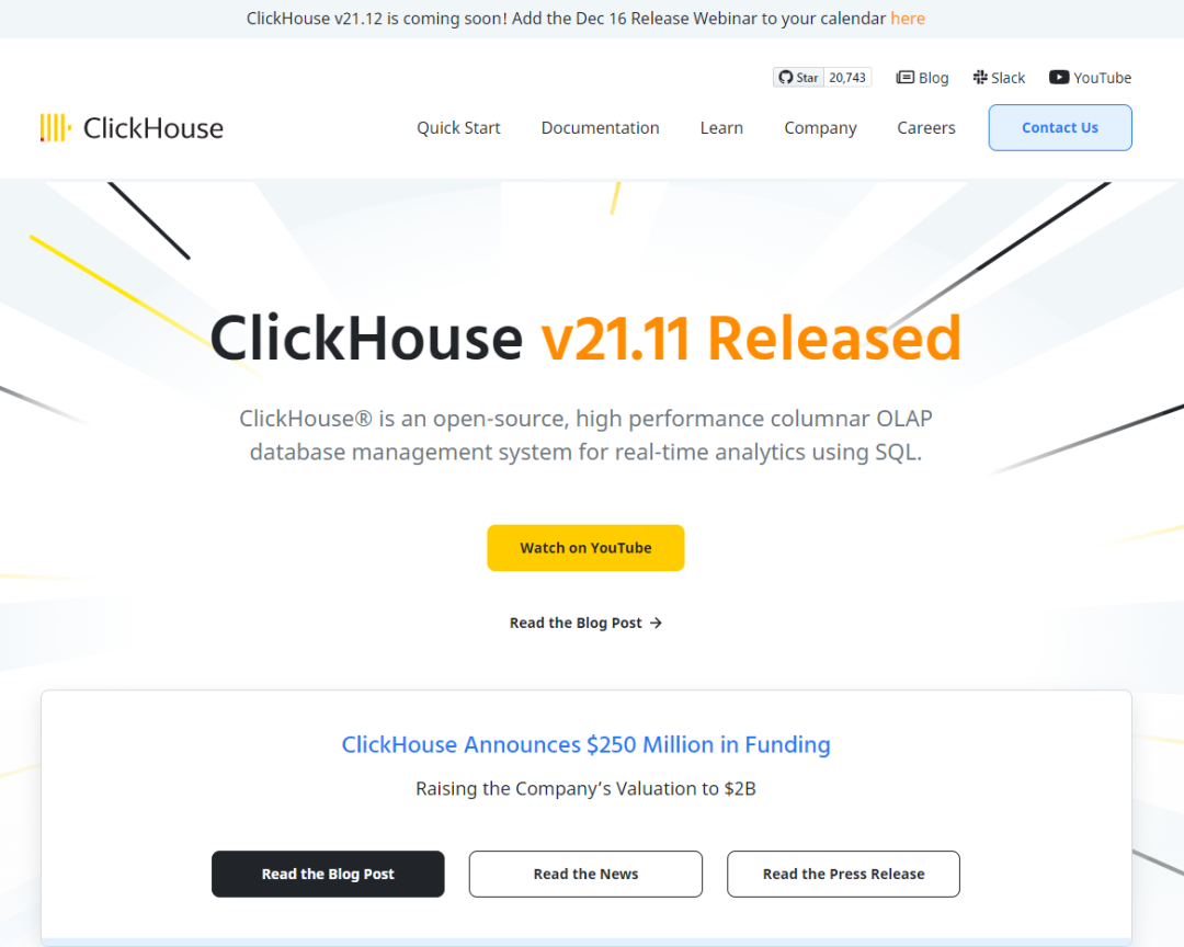 ClickHouse的官网,https://clickhouse.com/#quick-start,有很多实用资料,从介绍来看,最新的是21.11版本,