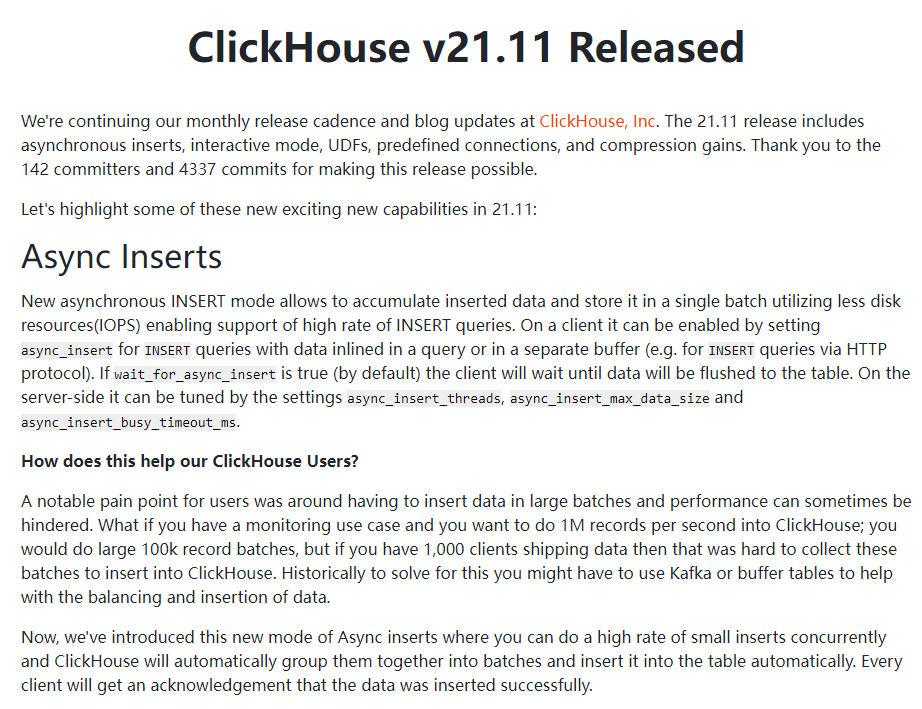最新的这个21.11支持异步插入,进一步提升数据插入和存储的性能,