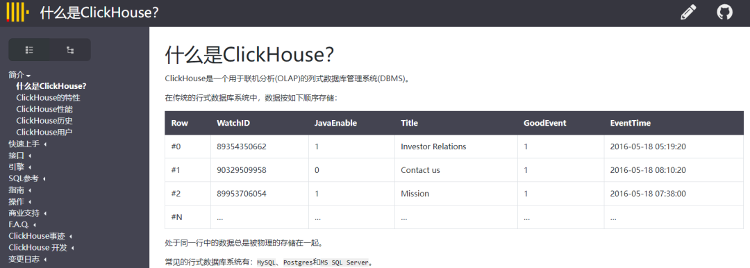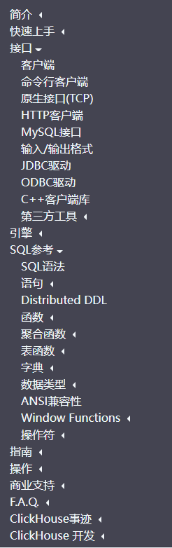ClickHouse的文档,非常丰富,而且支持中文,一方面可能是由于国内厂商的参与度很高,另一方面可能来自于中俄的战略伙伴关系,好邻居,