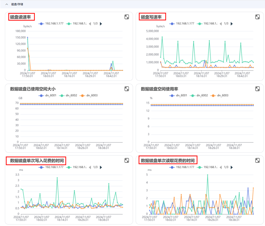 点击磁盘/存储菜单,可以查看磁盘I/O使用率,重点关注磁盘读写速率以及时延是否符合预期,如图3所示。