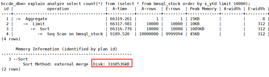 3)数据库动态内存不足,导致业务执行报错(ERROR:memory is temporarily unavailable )或者性能不足。当动态内存不足时,可以通过如下SQL语句找出内存消耗高的SQL语句,以便排查是否存在不优的SQL 语句。借助SQL的执行计划分析,可以检查是否有不合理的join顺序,或者是否存在非必要的排序操作,从而避免消耗大量内存。