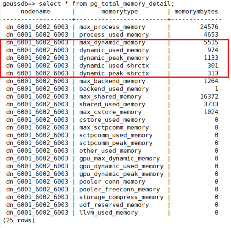 如果需要排查由非业务SQL语句导致的异常的内存消耗问题,比如内存堆积、内存泄露等,GaussDB提供了丰富的内存相关的监控视图,可以通过下面的视图(如图13所示),查看数据库节点的内存消耗情况。