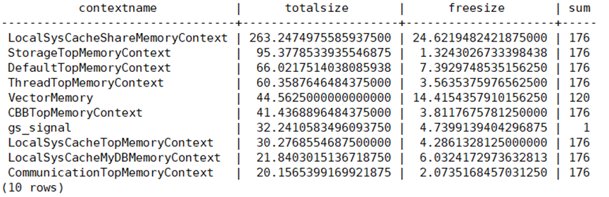 select contextname, sum(totalsize)/1024/1024 totalsize,sum(freesize)/1024/1024 freesize, count(*) sum fromgs_thread_memory_context group by contextname order by sum desc limit 10;