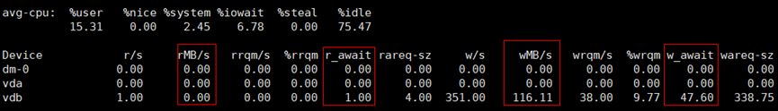 通过 iostat 命令,可以查看数据库节点 I/O 的繁忙度和吞吐量,分析是否存在由于I/O 导致的性能瓶颈。如图15所示: