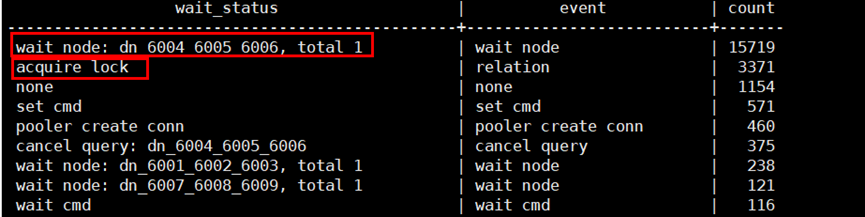 如图19所示,该时间段数据库占比最高的两个等待事件,一个是等待dn_6004_6005_6006分片返回执行结果,这需要进一步排查该分片上性能瓶颈的原因;另外一个等待事件是acquire lock(relation),表示存在大量的表级锁等待。