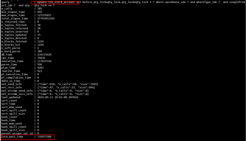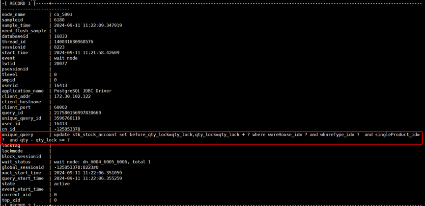 利用上一步查询出来的query_id,并结合gs_asp视图,可以通过如下语句获取该SQL语句的详情。查询结果如图22所示,可以看到,阻塞该语句的也是同一张表的update语句,这表明是由于并发更新同一行数据所导致的锁冲突。