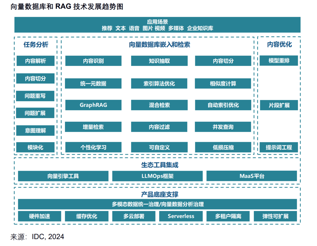 相比于非原生向量数据库(在非关系型数据库中加入向量检索引擎),原生向量数据库在设计之初即为了更好地管理非结构化数据,因此在可扩展性、准确率、数据规模、QPS等上有优势,以及自研embedding模型,会提高LLM生成内容的效果和精准度。星环科技云原生分布式向量数据库Transwarp Hippo支持存储、索引以及管理海量的向量式数据集,具备高可用、高性能、易拓展等特点,支持完备的索引以及支持稀疏向量与稠密向量、全文与向量2种混合检索、满足不同场景中的高效率与高精度要求,并通过索引生命周期管理和指令集优化等先进技术,大幅降低企业存储运维成本,提升整体检索性能。同时,向量数据库Hippo可基于星环自研多模型统一技术架构,实现向量数据、图数据、关系型数据、时序数据等多模型数据的统一存储管理,帮助企业快速构建和应用私有知识库,解决大模型落地过程中存在的领域知识缺乏、知识时效性低、隐私数据安全性低、AI幻觉等问题,帮助企业高效、低成本地落地领域大模型应用,并通过多模型数据的灵活融合,助力企业探索和落地更丰富的创新业务场景。报告中还从产品底座支撑、生态工具集成、任务分析、向量数据库嵌入与检索等多个方面介绍了向量数据库与RAG的技术发展趋势。如在产品底座支撑方面,实现多模态数据库下的统一数据管理和 AI 检索是企业需求的重点;工具集成方面,需要与向量引擎工具、LLMOps 框架、MaaS 平台做集成,为用户提供搭积木的 AI 建设方式,屏蔽底层复杂的逻辑,尽可能地简化底层逻辑和重复工作。
