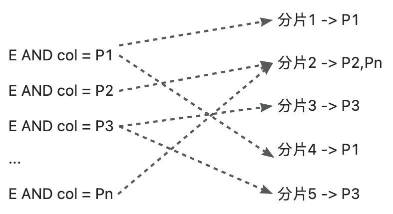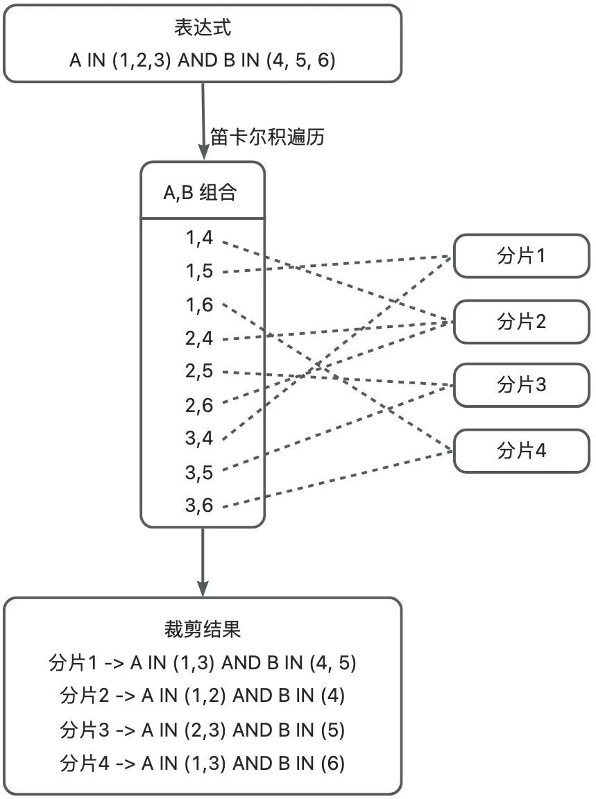 设定最大计算次数, 从最长的 IN 表达式依次纳入笛卡尔积计算, 中途如果超出了最大计算次数, 则将剩余的 IN 表达式看做一个整体, 不再对其裁剪. 如果单次计算会覆盖所有分片, 则认为该表达式不具备分片裁剪能力, 直接退出裁剪
