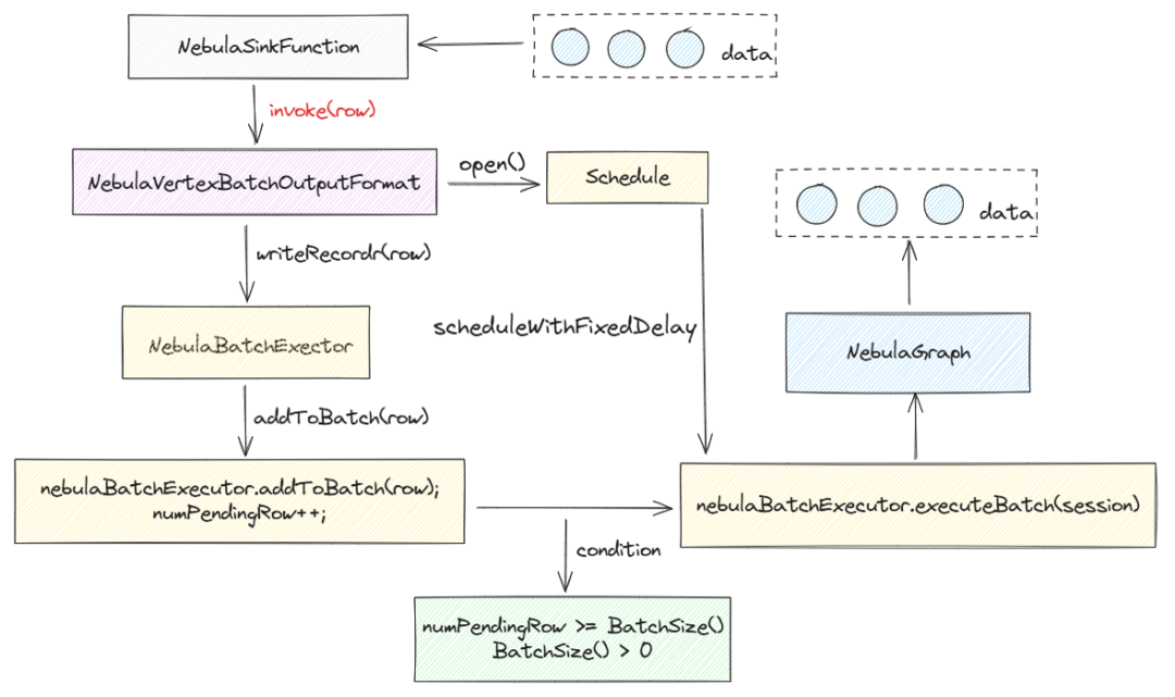 随后, numPendingRow (待处理记录数)会进行累加。当累加的记录数达到配置的批量大小(即 executionOptions.getBatchSize() > 0 )而且达到批处理的最大容量时,将触发 nebulaBatchExecutor.executeBatch(session) 方法的调用。