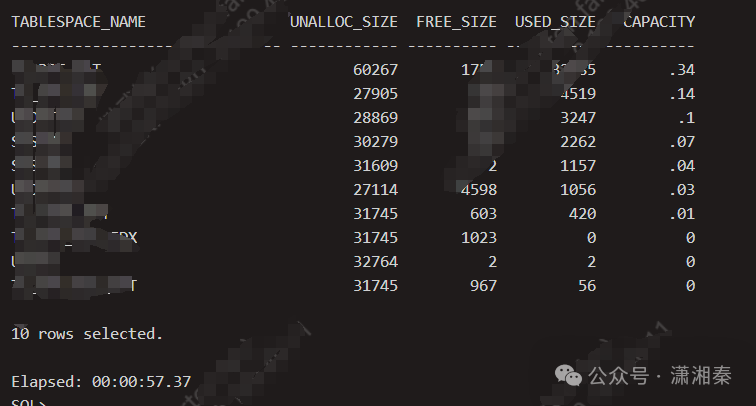 SELECT t.*FROM (SELECT a.tablespace_name,a.unalloc_size,nvl(f.free_size, 0) free_size,a.used_size - nvl(f.free_size, 0) used_size,round((a.used_size - nvl(f.free_size, 0)) /(a.unalloc_size + a.used_size),2) capacityFROM (SELECT tablespace_name,round(SUM(bytes) / 1024 / 1024) free_sizeFROM dba_free_spaceGROUP BY tablespace_name) f,(SELECT tablespace_name,round(SUM(user_bytes) / 1024 / 1024) used_size,round(SUM(decode(autoextensible,'YES',decode(sign(maxbytes - user_bytes),-1,0,maxbytes - user_bytes),0)) / 1024 / 1024) unalloc_sizeFROM dba_data_filesGROUP BY tablespace_name) aWHERE 1 = 1AND a.tablespace_name = f.tablespace_name(+)) tWHERE capacity >= 0.85AND (unalloc_size + free_size) < 4000AND (unalloc_size + free_size) < used_size / 2ORDER BY capacity DESC;