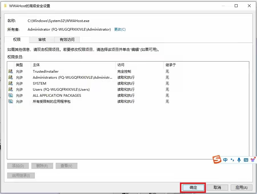返回wwahost属性,在“安全”选项中点击“确定”。