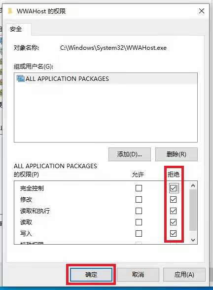 然后在ALL APPLICATION PACKAGES的权限中全部勾选为拒绝。点击确定。