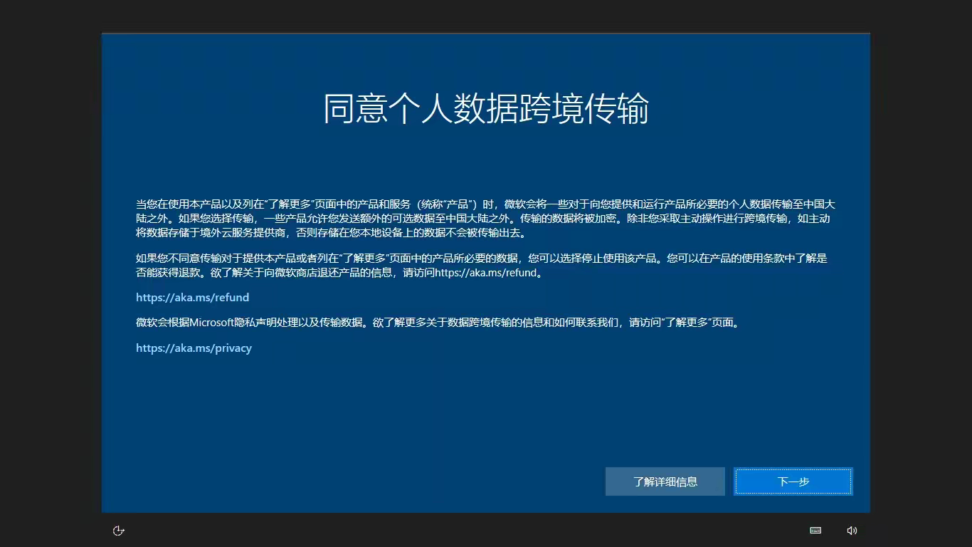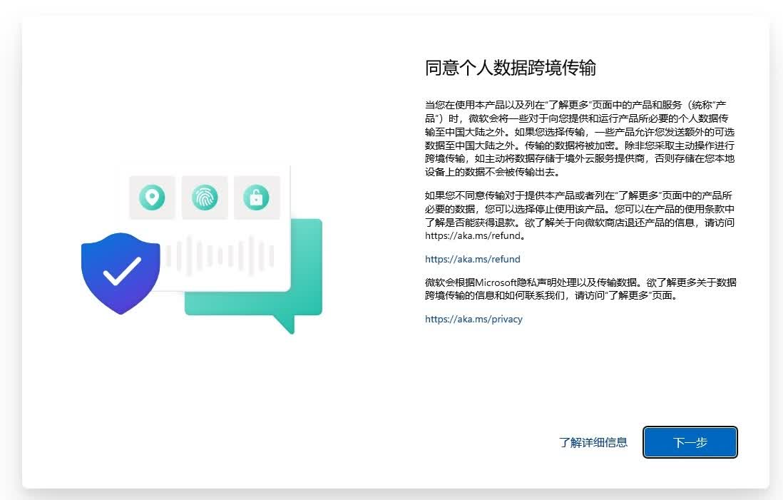 最近只要用户安装或更新win10、win11系统后重启,都会遇到:同意个人数据跨境传输的提示。用户如果不点击“下一步”就进入不了系统,点击了又担心个人数据和隐私泄露。这是境外想非法获取我们数据的阴招,我们不能让这些人的阴谋得逞,绝不能同意,必须关闭!(这是win10系统弹出的)